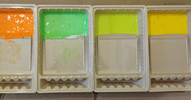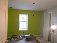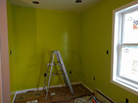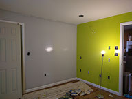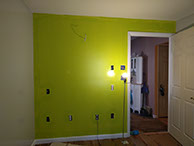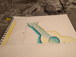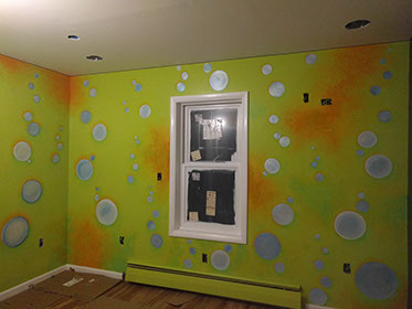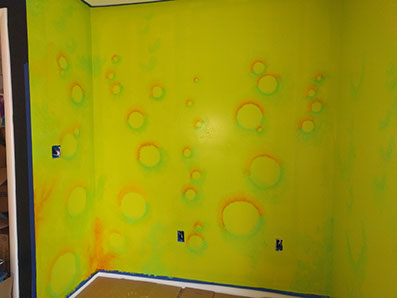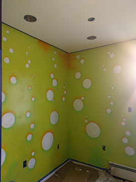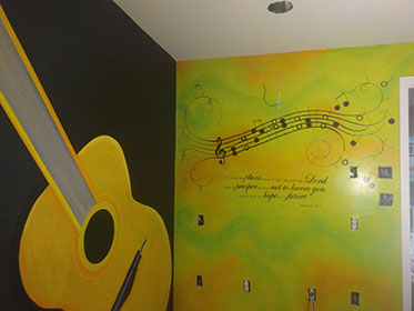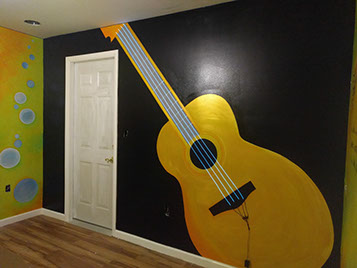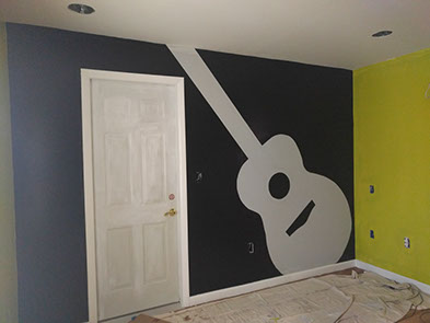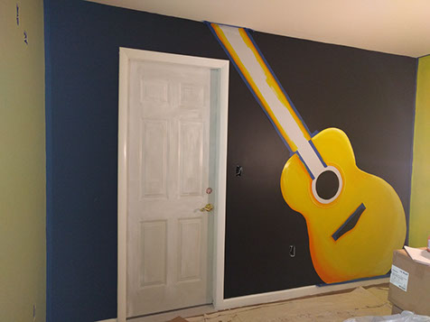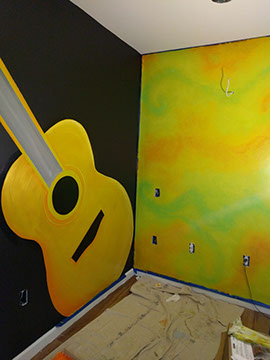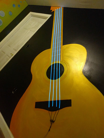 Day Two: Transfer guitar designs on the wall, and blend colors on the neon green walls.